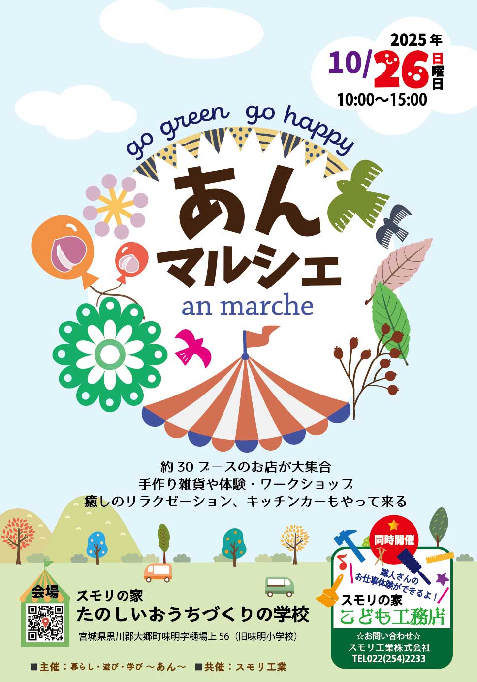 2025年10月26日(日)、スモリの家の「たのしいおうちづくりの学校」で、大人気イベント「こども工務店」と「あんマルシェ」のコラボイベントを開催いたします!