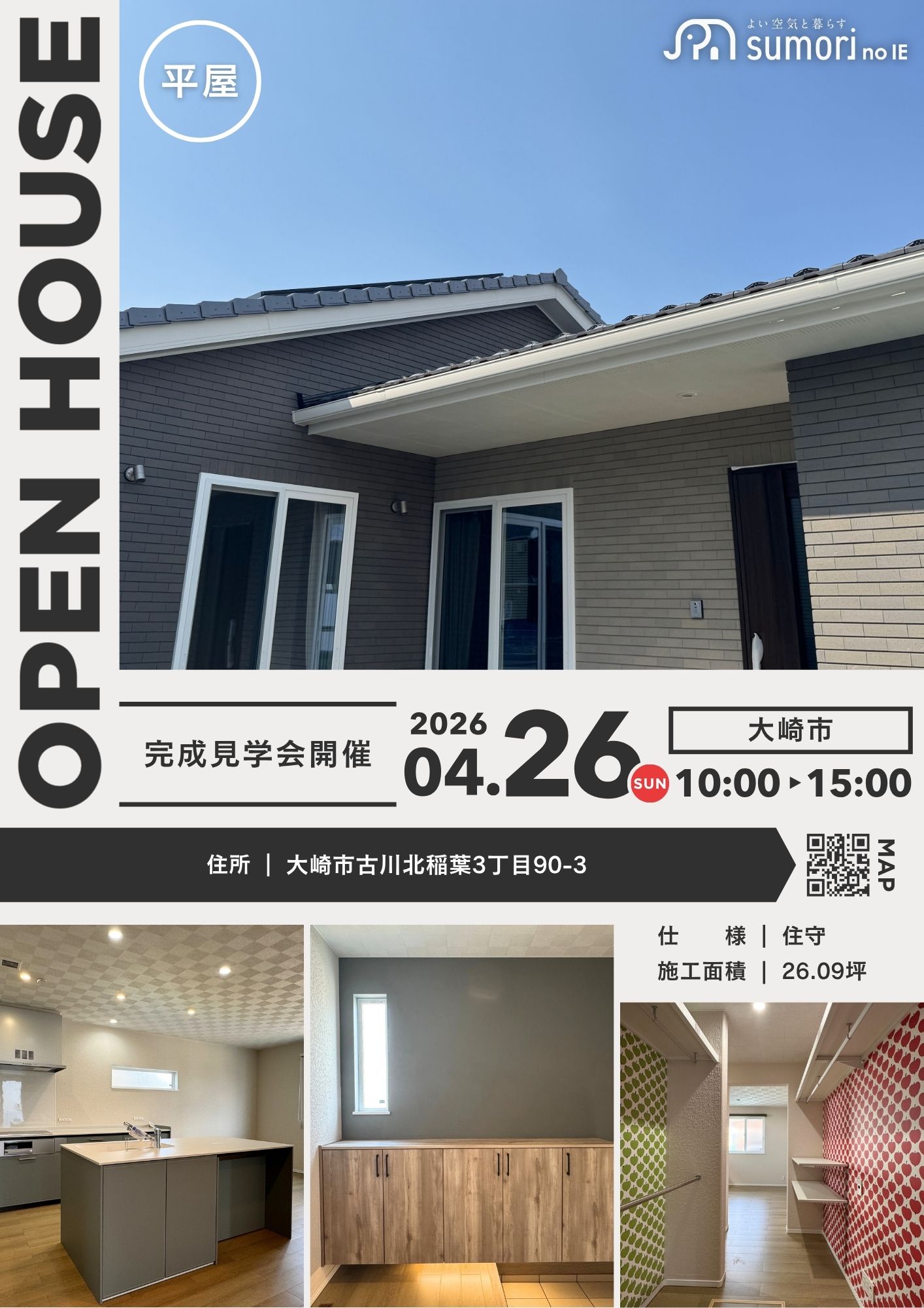 4月26日(日)は、大崎市にて開催いたします。今人気の平屋のお宅で、空間の広がりを感じる開放的な設計が特徴。ワンフロアのため家中の移動が楽&家事効率がアップする動線も魅力です。デザイン性のある内装でおしゃれな雰囲気もありながら、収納もたっぷり確保してすっきり暮らせる工夫も万全。LDKはアイランドキッチン中心に構成され、家族とのつながりが大切にできる間取りとなっております。