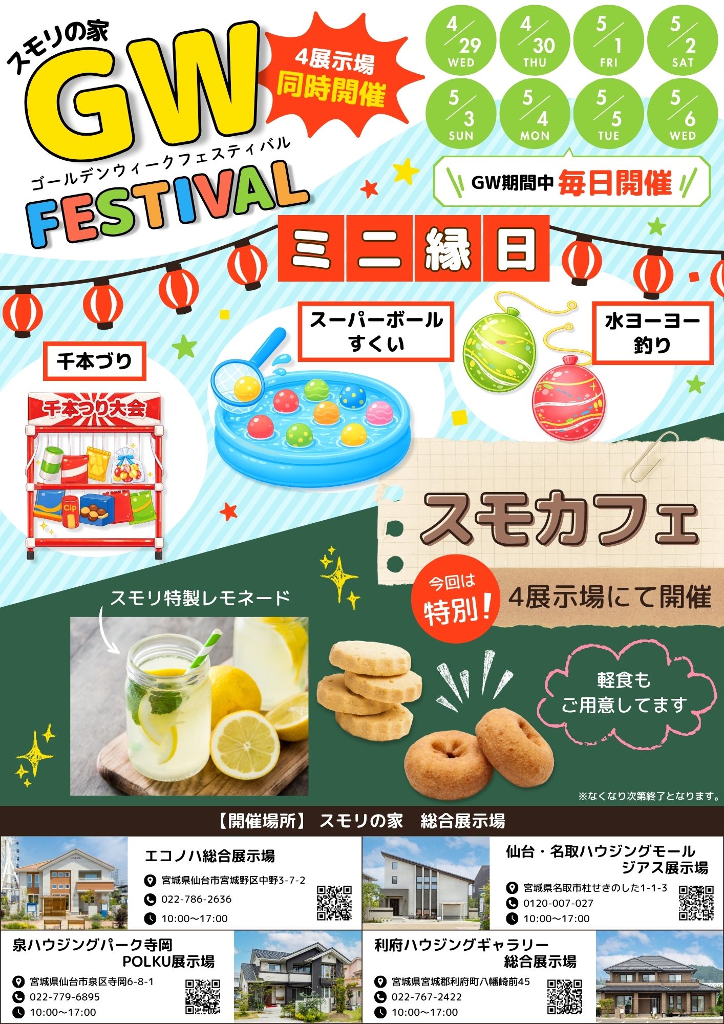 4月29日(水・祝)~5月6日(水・祝)の8日間、スモリの家の4展示場を会場に「ゴールデンウィークフェスティバル」を開催いたします!