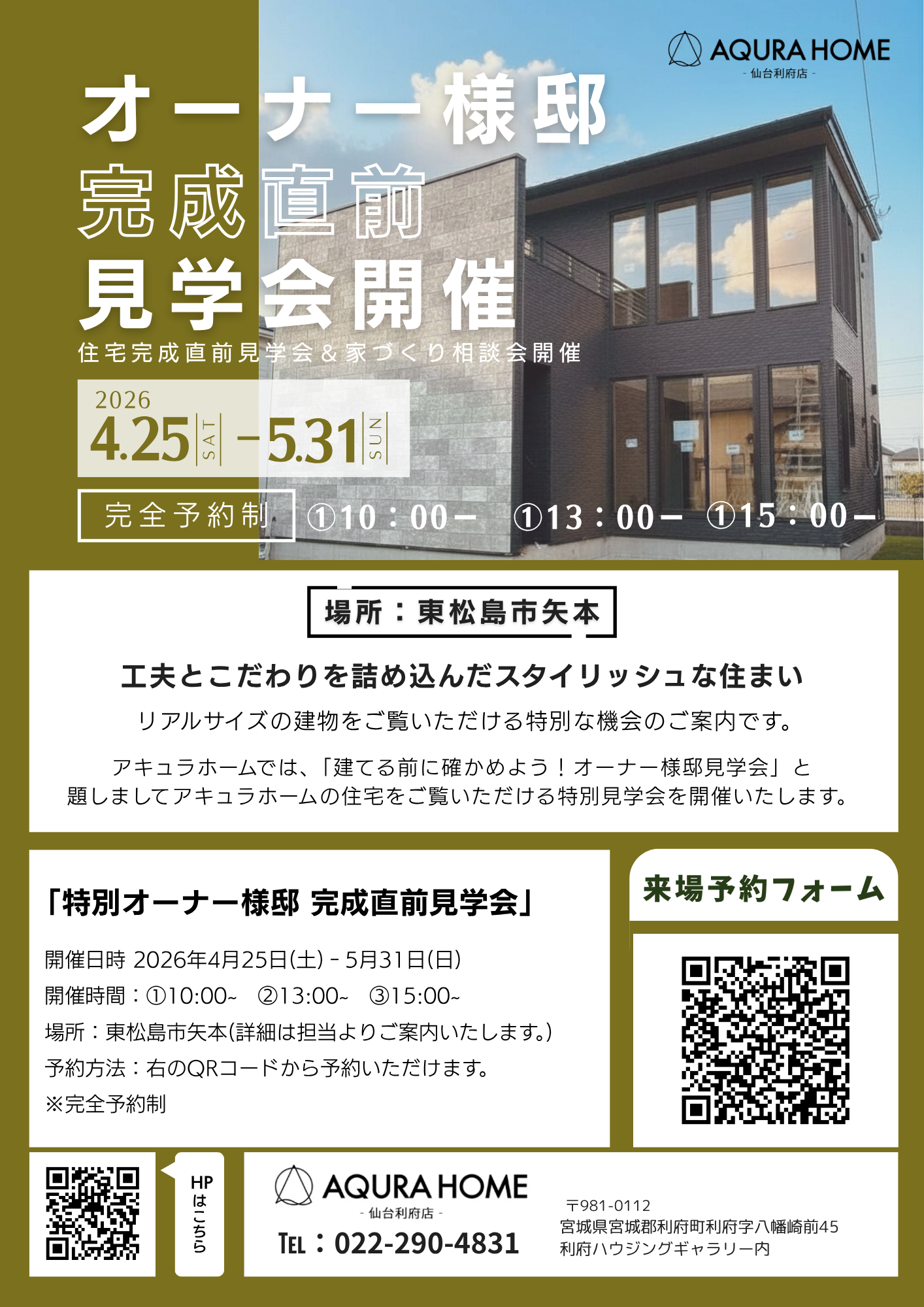 今回ご見学いただけるのは、展示場ではなく実際にオーナー様が建てられたリアルなお住まい。広さや動線、収納計画など、実際の暮らしをイメージしながらご見学できます。